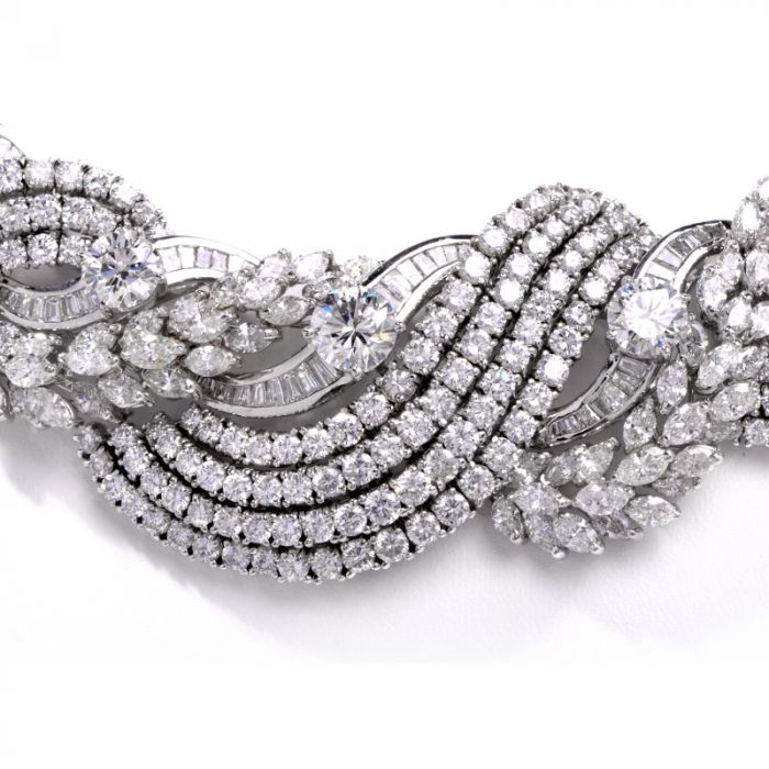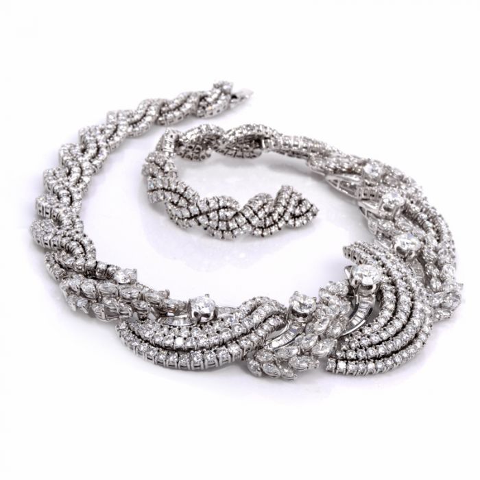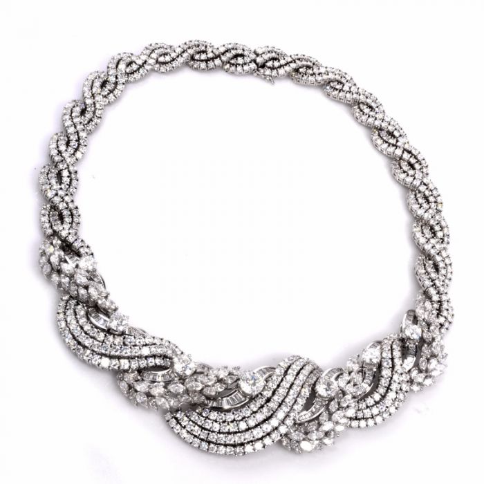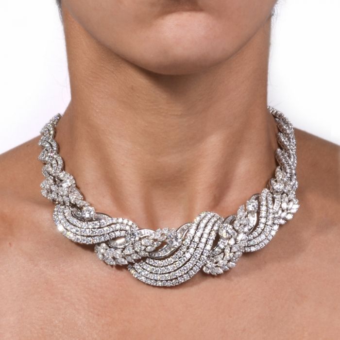 The necklace is covered with 570 genuine round cut diamonds, 104 genuine marquise-cut diamonds, and 75 genuine baguette cut diamonds all approx. 78.50ct, H-I color, mostly VS clarity with few SI’s. GRAND TOTAL DIAMOND WEIGHT is approx. 86.00 carats.